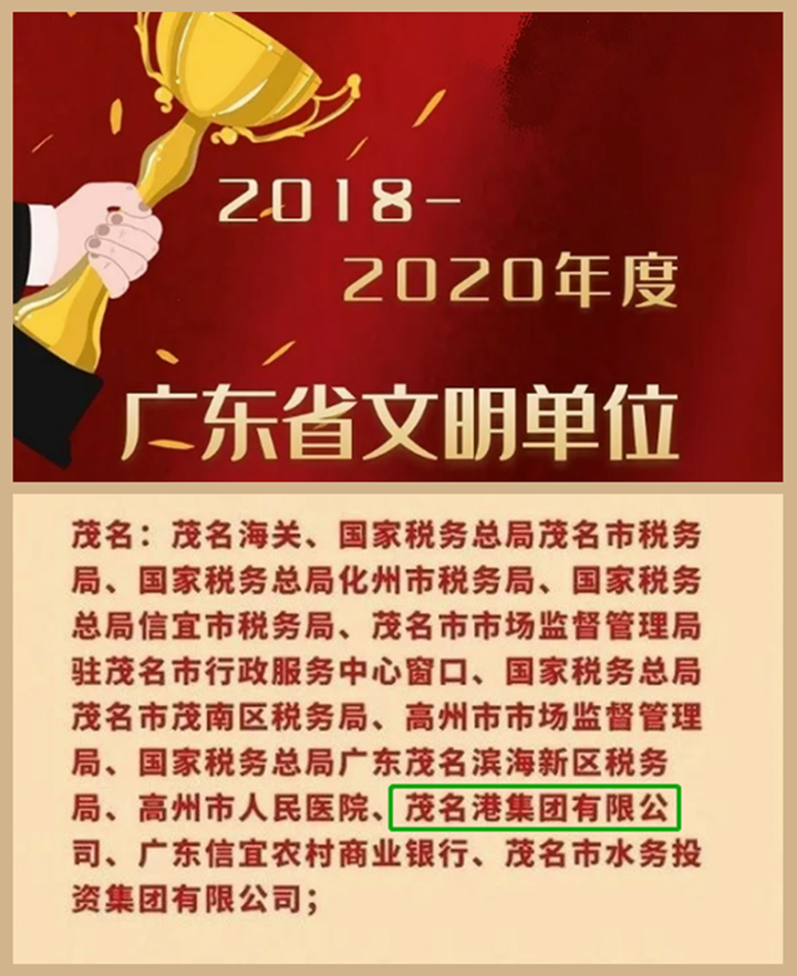 近日,廣東省精神文明建設(shè)表彰大會在廣州隆重舉行。作為成立僅八年多時間的市屬國有企業(yè),茂名港集團榮獲廣東省2018-2020年度文明單位稱號。