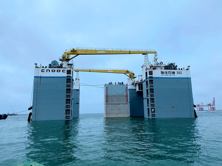 6月1日晚上8時,博賀新港區(qū)項(xiàng)目建設(shè)傳來喜訊——茂名港博賀新港區(qū)東區(qū)化工碼頭項(xiàng)目第一個沉箱順利安裝完成!