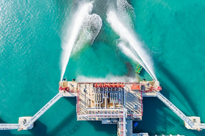 2023年12月7日下午,隨著公用工作樓首層消防泵房的紅色“巨獸”傳出一聲噪響,矗立10萬噸級成品油泊位兩側(cè)靠船平臺上的消防炮塔噴射出兩道水柱,標志著茂名港博賀新港區(qū)東區(qū)10萬噸級成品油碼頭項目大型消防泵組和消防炮塔聯(lián)合運行成功,為項目即將轉(zhuǎn)入運營提供消防安全保障。