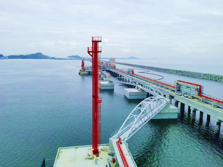 此次安裝的4臺裝卸臂堪稱碼頭“大動脈”,每臺高23.3米、重41.83噸,采用電/液驅(qū)動技術(shù),具備高效、安全、穩(wěn)定的輸油能力,全部投用后,每年可助力完成1650萬噸原油輸送任務(wù),將大幅提升茂名港原油接卸與中轉(zhuǎn)效率。同步安裝的具有浮動功能的登船梯高26.5米、重約32噸,根據(jù)潮汐自動調(diào)節(jié)梯高度的智能設(shè)計,為10萬到30萬噸級的船舶提供了安全便捷的通道;2座高29米的消防炮塔上的消防水炮最大覆蓋半徑達99米,其射程遠、流量大,如同“安全衛(wèi)士”構(gòu)筑起碼頭前沿的安全保障網(wǎng)。
