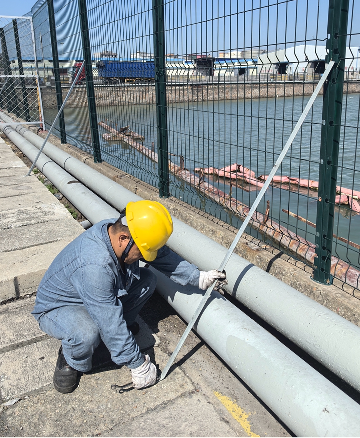 碼頭之間周界圍擋是安全管控的重要屏障,也是港口設(shè)施保安工作重要設(shè)施之一。按外委維修方案,需整體制作圍擋,費(fèi)用約8萬元。 “能不能自己干?!”黨員維修組現(xiàn)場(chǎng)測(cè)量圍擋尺寸,設(shè)計(jì)“鋼管立柱+鋼絲網(wǎng)格+防撞條”的簡(jiǎn)易圍擋方案,反復(fù)論證可行性后,決定擼起袖子自己干!為確保穩(wěn)固性,黨員維修組用水平儀一米一米測(cè)標(biāo)高,用扳手一顆一顆緊螺栓;為防臺(tái)風(fēng)天氣傾倒,把鋼管底部焊接在混凝土基座,用水平尺校準(zhǔn)“毫米級(jí)”垂直度。5天的連續(xù)作業(yè),為港口經(jīng)營(yíng)公司周界圍擋起整齊牢固的“安全防線”。
