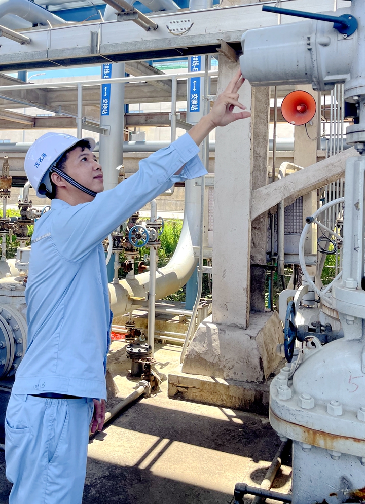 2024年是碼頭和庫區(qū)的重要歷史節(jié)點,何雄勝同志以“全天候”“無休息”的戰(zhàn)斗姿態(tài)沖鋒在前。油氣回收系統(tǒng)投用前,他連續(xù)堅守崗位,精準指導(dǎo)水沖洗、吹掃、氣密等關(guān)鍵工序,細致核查涉及液氮深冷工序等危險工藝的300余個法蘭點!把b置運行不容疏忽,必須把安全放在首位!”這是他堅守的信念。正是這份黨員的極致嚴謹,確保了裝置一次性成功聯(lián)調(diào),運行指標符合設(shè)計規(guī)范。他還指導(dǎo)用分析儀等設(shè)備精確測試不同工況能耗,為節(jié)能降耗打下了堅實基礎(chǔ)。面對首次卸船、裝船、茂石化長輸管線進罐等多項艱巨任務(wù)的圓滿完成,油污滿面也難掩他臉上的欣慰:“這就是黨員應(yīng)有的‘進度條’!”