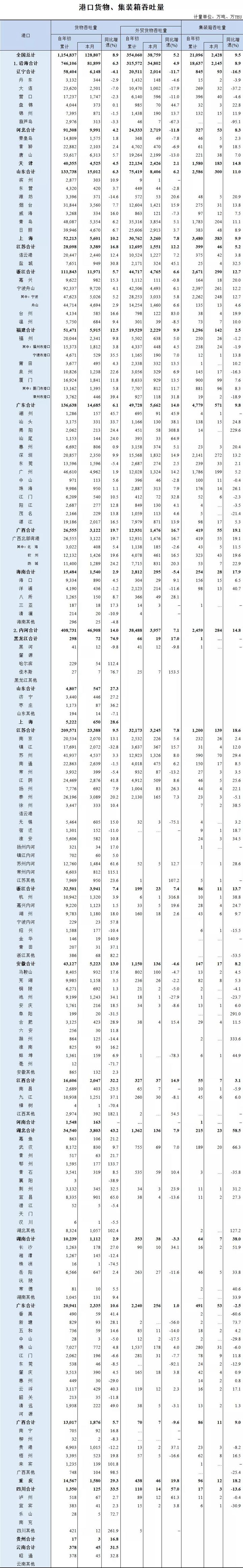 根據(jù)交通運(yùn)輸部數(shù)據(jù),1-9月,全國港口完成貨物吞吐量115.48億噸,同比增長(zhǎng)8.9%;完成集裝箱吞吐量2.11億TEU,同比增長(zhǎng)9.5%。其中,沿海港口完成貨物吞吐量74.6億噸,同比增長(zhǎng)6.3%;完成集裝箱吞吐量1.86億TEU,同比增長(zhǎng)8.9%。 9月份,兩大榜單排名未見變化,只是增速進(jìn)一步放緩,集裝箱吞吐量方面東莞港已與去年持平,福州港吞吐量增速轉(zhuǎn)為負(fù)數(shù),不過從總體來看,集裝箱吞吐量與貨物吞吐量的增速降幅不大,已進(jìn)入平穩(wěn)增長(zhǎng)區(qū)間。從海關(guān)數(shù)據(jù)來看,9月份當(dāng)月進(jìn)出口同比增長(zhǎng)15.4%,增速較8月份回落了3.5個(gè)百分點(diǎn)。 港口圈認(rèn)為,這不意味著港口總體向好的發(fā)展趨勢(shì)就此打住,9月份,臺(tái)風(fēng)對(duì)長(zhǎng)三角、東南沿海、珠三角各大港口生產(chǎn)運(yùn)輸都有影響,限電也波及各制造業(yè)大省,可能導(dǎo)致出口貨物減少。但這些因素的陰霾不會(huì)持續(xù)太久,在國家力保煤電供應(yīng)的政策下,第四季度港口生產(chǎn)數(shù)據(jù)仍將保持相對(duì)穩(wěn)定的增長(zhǎng)。 附交通運(yùn)輸部完整數(shù)據(jù):