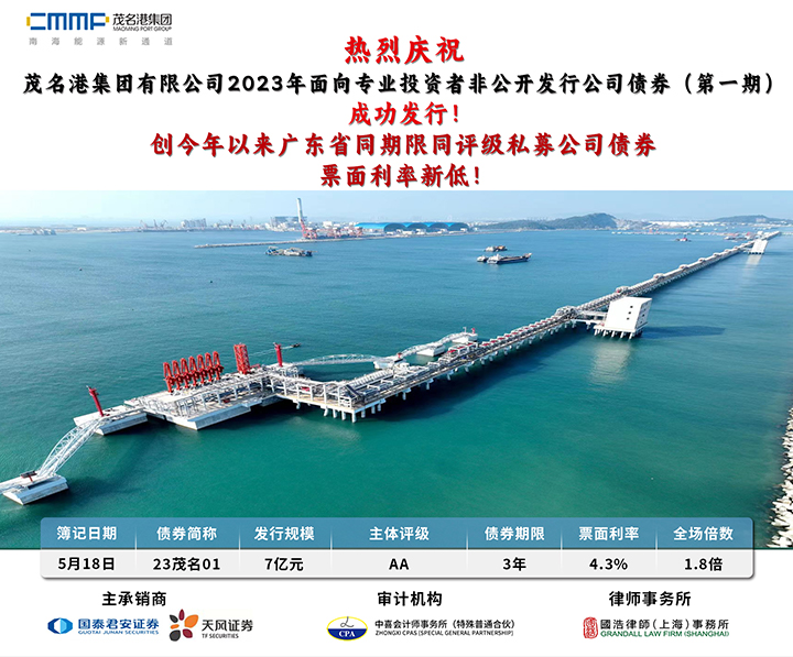 5月18日,茂名港集團(tuán)2023年非公開(kāi)發(fā)行公司債券成功發(fā)行,募集規(guī)模7億元,期限為3年,票面利率4.3%,創(chuàng)下今年以來(lái)廣東省同期限同評(píng)級(jí)同品種票面利率新低,為集團(tuán)后續(xù)融資奠定了良好基礎(chǔ)。