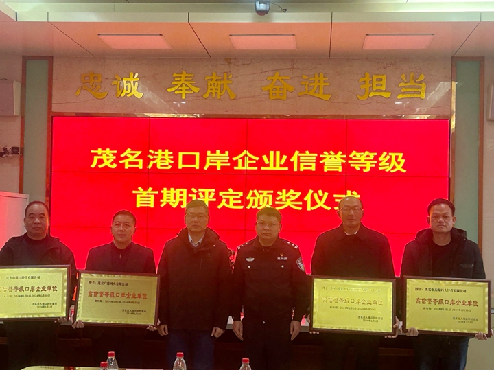 1月25日,口岸企業(yè)信譽等級評定暨口岸安全管控工作座談會在茂名出入境邊防檢查站隆重召開,集團下屬企業(yè)茂名市港口經營有限公司榮獲茂名出入境邊防檢查站首批“高信譽等級口岸企業(yè)單位”!會上,茂名出入境邊防檢查站、茂名市商務局及茂名市各口岸企業(yè)一起共謀口岸經濟發(fā)展之路,共商口岸安全管控之計,并對茂名港口岸范圍評選出的首批四家高信譽等級口岸企業(yè)進行了表彰。