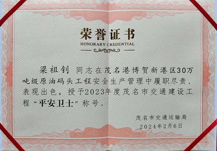 茂名市交通建設(shè)工程“平安衛(wèi)士”、30萬噸級原油碼頭工程項目經(jīng)理梁祖釗表示:“30萬噸級原油碼頭工程項目榮獲“平安工地”榮譽稱號,不僅是茂名市交通局對我們項目團隊辛勤付出的肯定,更是對我們安全管理工作的最高褒獎。作為項目經(jīng)理,我深感榮幸與自豪,同時也深知這份榮譽背后所承載的責(zé)任與擔(dān)當(dāng)。在集團黨委的堅強領(lǐng)導(dǎo)和集團安環(huán)委的正確指導(dǎo)下,我將繼續(xù)和項目團隊成員共同努力把項目安全工作抓好管好!為集團重點項目高質(zhì)量建設(shè)保駕護航!”(通訊員:張春浩)