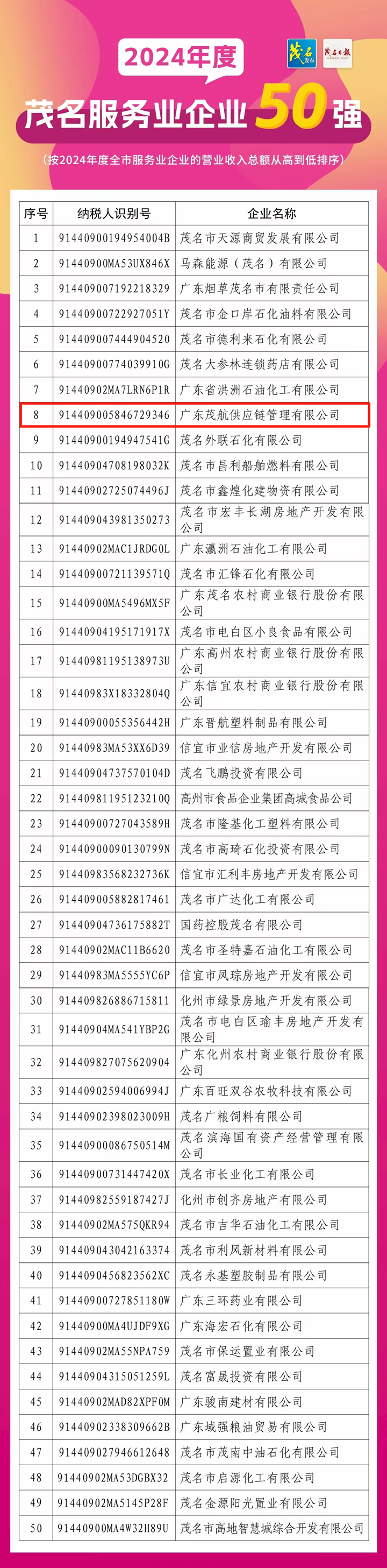 根據茂名市企業(yè)聯合會于2025年7月15日發(fā)布的通報,集團下屬茂航供應鏈公司以優(yōu)異的業(yè)績表現位列茂名企業(yè)100強第23位,較2023年第37位躍升14名,并首次躋身茂名服務業(yè)企業(yè)50強第8位。此次雙榜單的歷史性突破,標志著茂航供應鏈公司從傳統(tǒng)供應鏈貿易商向供應鏈科技企業(yè)的轉型取得實質性成果。
